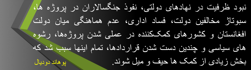 بعد از چهل سال حوادث ناگوار، ووقوع حادثه یازده سپتمبر ایالات متحده امریکا در فکر تغییر بینادی در افغانستان شد و جامعه ی جهانی رادر سال ۲۰۰۱ م. باخود یکجا وادار نمود تا افغانستان دارای یک حکومت مشروع ودیموکراتیک گردد، توقع می رفت که جنگها توقف یابد، جنگسالاران از عرصه ی قدرت گوشه و کناره گردد یک حکومت خوب و خدمتگذار ساخته شود، پروسه دیموکراتیک شروع وجامعه مبتنی بر عدالت ساخته شود. کمکها را شروع نمود، ولی نتیاج آن مطلوب نبود، بلکه برعکس، رژیم و نظام بعد از بیست سال فروریخت. به این نتیجه رسیدیم که: نبود ظرفیت در نهادهای دولتی، فساد اداری، عدم هماهنگی میان دولت افغانستان و کشورهای کمککننده در عملی شدن پروژهها و چندین دست شدن قراردادها از علتهای عمدهای هستند که سبب شده است بخش زیادی از کمکهای جامعه جهانی در افغانستان حیفومیل شوند.