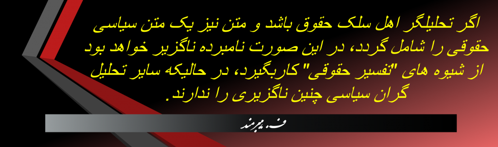 اگر تحلیل گر اهل سلک حقوق باشد و متن نیز یک متن سیاسی حقوقی را شامل گردد، در این صورت نامبرده ناگزیر خواهد بود از شیوه های “تفسیر حقوقی” کاربگیرد، در حالیکه سایر تحلیل گران سیاسی چنین ناگزیری را ندارند.