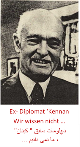 « “جورج اف. کینان” (George F. Kennan) امریکائی  ۷۵ ساله  ، متخصص شوروی در بارۀ عکس العمل امریکا، در رابطه با افغانستان، در پایان جنگ در سال ۱۹۴۵م، معاون رئیس نمایندگی، بعد سفیر “واشنگتن” در “مسکو”، یکی از معروف ترین کارشناسان، متخصص و شوروی شناس، در ایالات متحدۀ امریکا، که به عنوان ایجادگر و طراح “ستراتیژی”،  جلوگیری (“Containment”) اتحاد  شوروی، شناخته شده و در آغاز  فضای جنگ سرد، در سال ۱۹۴۷م تحت نام مستعار «مستر ایکس» (»Mr. X«)، در نشریهٔ «امور خارجی»، از او  توصیف شده است. دهم (۱۰) فبروری ۱۹۸۰م، ساعت ۱۳.۰۰ از “دیر شپیگل”، شماره ۷»