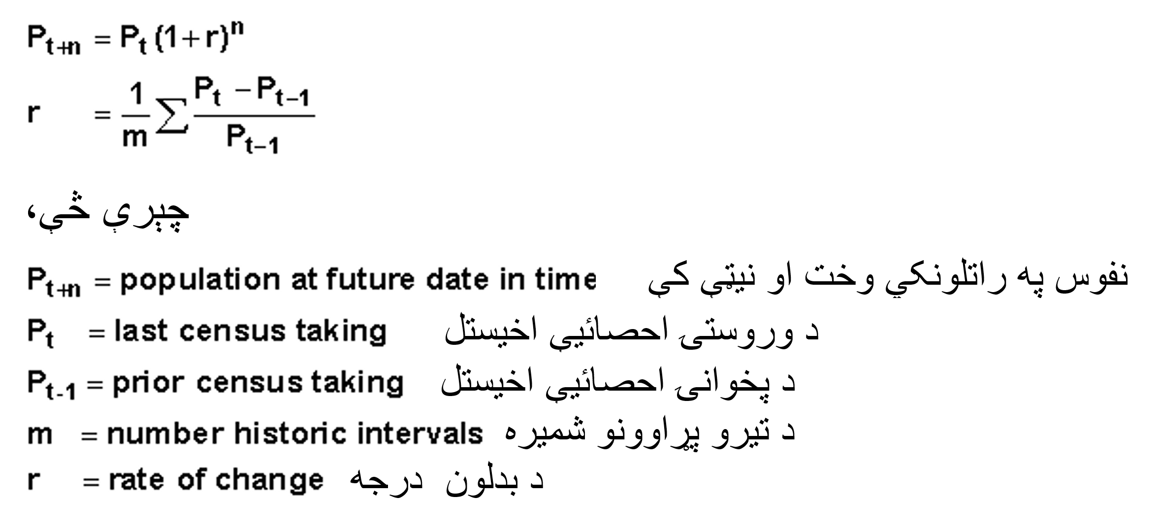 په دې فرمول کی P د پام وړ کال نفوس،  P0 د اساس کال نفوس، rد نفوسو د ودې فیصدی  او t دکلونو شمیر دی. دا فرمول شاید د یوې یا دوو دورو لپاره دقیق وی، خو د ډیرو کلونو لپاره په دې هر جز کی بدلون راځی ، همدا رنګه دا لاندی فرمول: