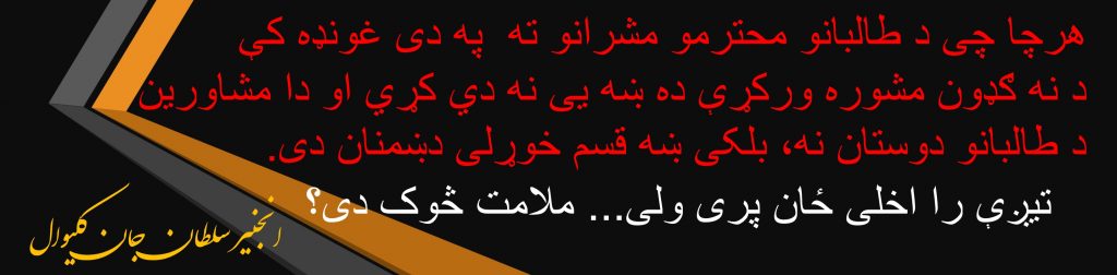 ښاغلو د طالبانو مشرانو! تاسو ته به د ملګرو ملتو اداره یوه ګوډاګۍ اداره ښکاری او د لویو زبرځواکونو د پلانو تطبیقونکی به درته معلومیږی چی دا یو حقیقت هم دی. خو همدا اداره کولای شی چي خپلې د امنیت شورا ته ستاسو په هکله هر ډول یی چی یی غوښتی وی راپور ورکاندی او د امنیت شورا بیا امریکا او یا بل زبر ځواک ته لکه د تیر په څیر ستاسو د نظامی سرکوبۍ جواز ورکاندی. تیرکرت خو پاکستان ستاسو لاس نیوی وکړ، او د بیا تشکل امکانات یی درته برابر کړل، خو داکرت پاکستان تاسو سره مرسته ځکه نه کوی چی تاسو د پاکستانی جنرالانو ډیرې غوښتنې و نه منلی او هغوی مو په ځان باندی بی باوره کړل. ستاسو ډیر مشران نن هم د سرحد په توګه د ډیورنډ لاین د نه منلو خبره کوی او داسی خبری د پاکستان نظامی چارواکو ته په قطعی توګه د منلو وړ خبری نه دی. تاسو باید په دی پوهیدلی وای چی هر د سترو سترګو لرونکی حیوان زمری نه وی. دا هم په یاد ولری که د امریکا په راتلونکو ټاکنو کی واک پخوانی جمهور رئیس دونالد ټرمپ تر د لاسه کړي، هغه د هفتی (۴۰) ملیونه ډالر در باندی په لومړی ورځ قطعه کوی، بیا به دی سل افغانی دیوی پاکستانۍ کلداری سره تبادله کیږی. فقر، ناداری او بیکاری به دی د هیواد ولسونه دی ته اړباسی چی یوی لورې ته د تیښتی د لاری په لټه کی شی. خبرې به ستغې وی او ستاسو به نه خوښیږی خو ماته خپله پوهه او تحلیل همدا وای.