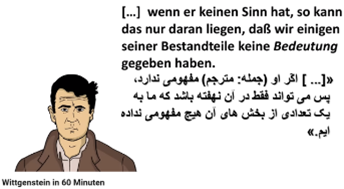 این عنوان از لکچر”داکتروالتر سیگلر” گرفته شده است. او  یکی از مدرسین در رشتهٔ فلسفه است که در «یوتوب»، در تحت عنوان ۶۰ دقیقه در معرفی، کتب و آثار فیلسوفان معروف «اروپا»، بطور انفرادی، برنامه های شفاهی و توضیحی، به پیش می برد، و اینبار در معرفی  “ویتگینشتاین” (متولد: ۲۶ اپریل ۱۸۸۹ در “ویانا”، “اتریش – هنگری”، وفات: ۲۹ اپریل ۱۹۵۱م در “کمبریج پادشاهی متحد”) مهمترین فیلسوف اتریشی در قرن بیست پرداخته و در مورد کتاب او تحت عنوان «فلسفۀ زبان»، که از او هم چنان با شهرت «فیلسوف» نامدار قرن بیست، یاد نموده، صحبت می کند.