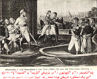 درین فرصت، برتانوی ها، شخصی را بنام “مالکُم” (Malcolm)، که از او بنام “ایجنت” سیاسی “اردوی برتانوی در مدراس” نامیده شده است، به دربار تهران می فرستند. درین منبع “شپیگل”، از تأریخ دقیق چنین سفر او به دربار تهران ذکر نشده است، اما در یک متن معلوماتی، “ویکیپیدیا”، از سفر او به “پارس” در سال ۱۸۰۸م، تذکر بعمل آمده است و گفته می شود که او به امر”لارد مینتو” (Lord Minto) به “پارس”، اعزام گردیده است. اما در آنزمان چون “نفوذ فرانسه” در تهران قوی بوده است، “بدون” پیشرفت قابل ملاحظه از ایران بر می گردد. بهر صورت از مؤفقیت های اولی او، یاد نشده است. بناءً، بار دیگر یک هیأت برتانوی، دو سال بعد هم به “تهران” فرستاده می شود. درین متن می خوانیم که همین “مالکُلم” در سال ۱۸۱۰م، نیز به “پارس” اعزام شده است، هم چنان گفته می شود، که درین زمان، برتانیه با تهران، رابطۀ مستقیم “دیپلوماتیک”، از طریق لندن برقرار داشته است. درین سالها در افغانستان آنزمان، پسران “تیمور شاه”، در جنگ بر سر تاج و تخت، درگیر بوده اند. “مالکُلم” بر اساس همین گزارش “شپیگل” توانسته است، پس از تلاش های پیگیر، در قدم اول، در تهران، “اتحادی” را با دربار تهران بوجود آورد. درین تعهدنامه، “پارس” به جانب “انگلستان”، تعهد نموده است که در صورت خطر علیه انگلیس، یعنی در حالت حملۀ “روسی – فرانسوی” بر “هند برتانوی”، “پارس” خود را مکلف ساخته است، تا بر افغانستان حمله کند. در جملات بعدی گزارش “شپیگل”، چنین می خوانیم: “با این همه، زمانی که “ناپُلیون” در جریان مذاکرات صلح با “روس ها” در “تلسیت” (۱۸۰۷Tilsit) () و در “کنگرۀ شهزادگان” در “ایرفورت” (Erfurt) آلمان، با “تزار الکسندر اول” („Zar Alexander I.“)، دیدار داشته است، درین فرصت، بار دیگر “پلان های روسی – فرانسوی“، در رابطه با تسخیر هند را، “پُخته” ساخته اند، درین مقطع زمانی است که، جانب برتانیه، از طریق “کمپنی تجارتی هند شرقی“، مستقیماً با پادشاه افغانستان، وارد مذاکره شده است.